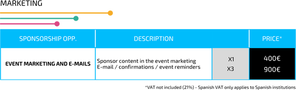 Opportunity for sponsors to hang a banner, place an advert in the event program, landing or registration pages or display their logo. Sponsors will gain more exposure and opportunity for ongoing interaction with attendees