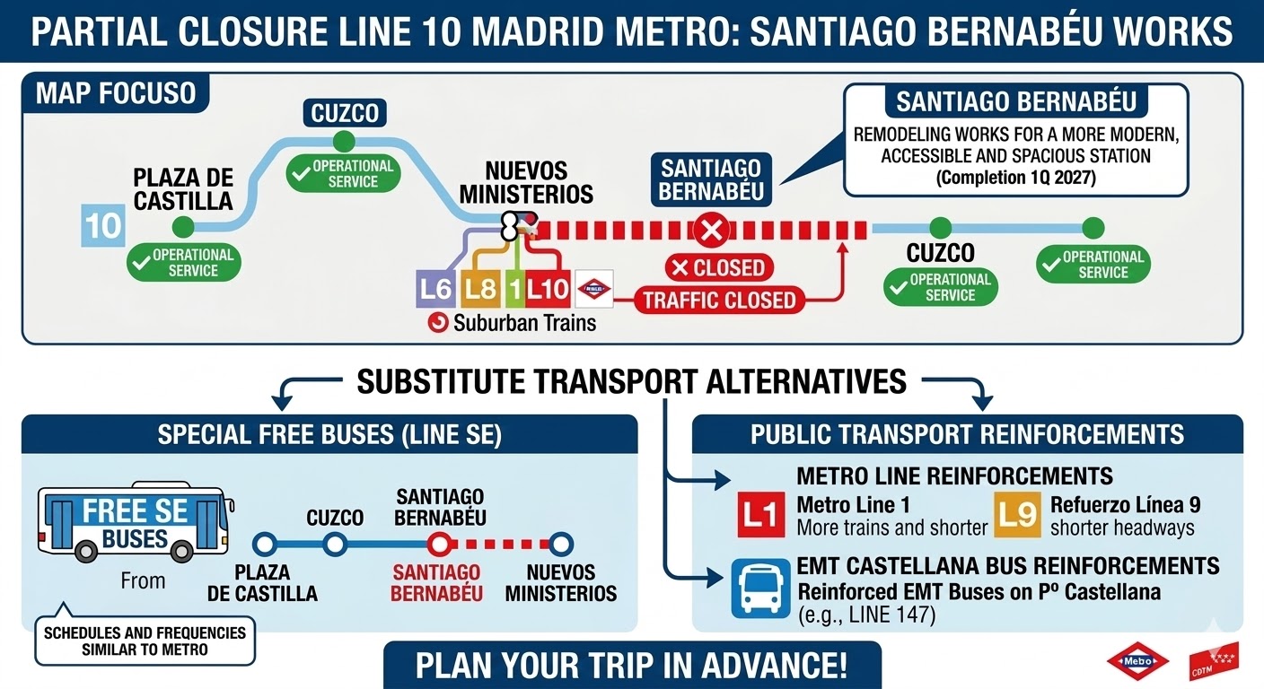 Attention passengers! Due to remodeling works at Santiago Bernabéu station, the Line 10 of Madrid Metro will be partially closed between Nuevos Ministerios and Cuzco stations from March 28th until the end of the year. Please use the alternative free shuttle buses or reinforced public transport services mentioned above for your journey.
